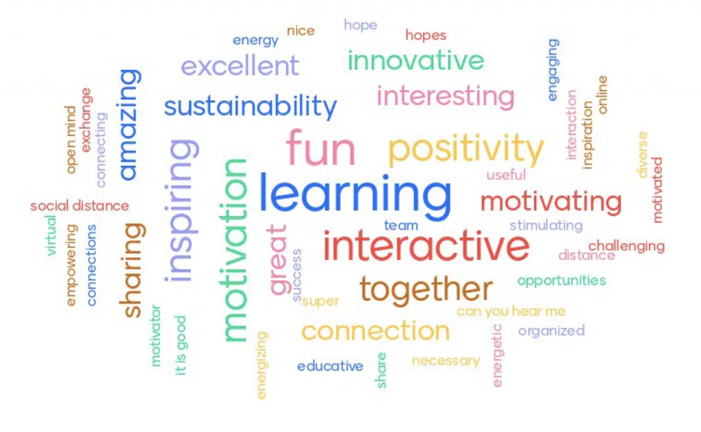 Het is natuurlijk fijn zoiets als team te doen. Ik had een groepje van 3 collega’s uit de alliantie waar ik mee samen werkte. Daarmee had ik een Whatsapp groep, die we vooral gebruikten om even kort af te stemmen wie wat doet. We startten elke dag om 9 uur met een terugblik en een vooruit blik. Als kers op de taart konden we de week met de 15 Nederlandse deelnemers wel afsluiten met een borrel. Hieronder de wordcloud als evaluatie door de deelnemers.